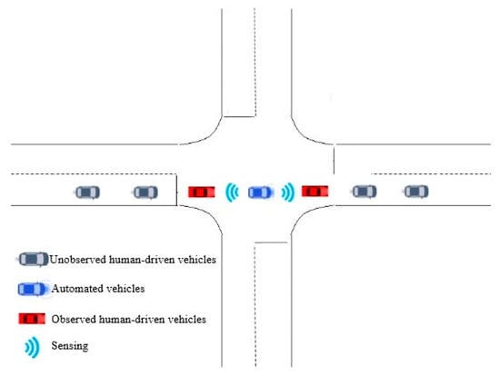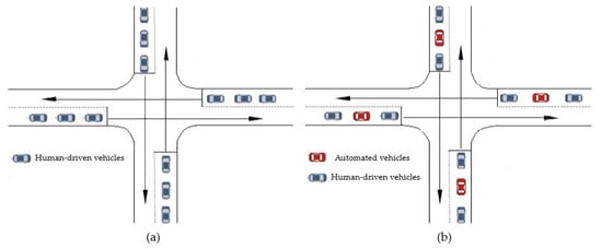 Traffic congestion leads to a lot of wasted time and slow traffic, and it is one of the main challenges that traffic management agencies and traffic participants have to overcome. According to a national motor vehicle crash survey of the United States, 47% of collisions in 2015 happened at intersections []. Automated vehicles (AVs) have recently shown the potential to prevent human errors and improve the quality of a traffic service, with full autonomy expected as soon as 2050 []. This means of transportation can save the economy of the United States approximately $450 billion each year []. Recently, the intelligent transport system (ITS) domain was developed to provide a smoother, smarter, and safer journey to traffic participants. The early applications of ITS, such as traffic control in Japan, route guidance systems in Berlin, or Intelligent Vehicle Highway Systems in the United States, have been in use since the 1980s. However, the ITS domain concentrates only on intelligent techniques located in vehicles and road infrastructures. To solve communication problems between vehicles and road infrastructures, cooperative intelligent transport systems (C-ITS) can be used to enable those systems to communicate and share information in real time to provide safe and convenient travel. Motivated by the uncertainty in the application of AVs in real environments, this study focuses on mixed-autonomy traffic settings, in which complex interactions between AVs and human-driven vehicles occur in various continuous control tasks.