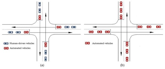 Leading autonomous vehicle experiments at a non-signalized intersection: (a) mixed-autonomy traffic with autonomous vehicle (AV) penetration rates ranging from 10% to 90% in 10% increments; (b) full-autonomy traffic with a 100% AV penetration rate.