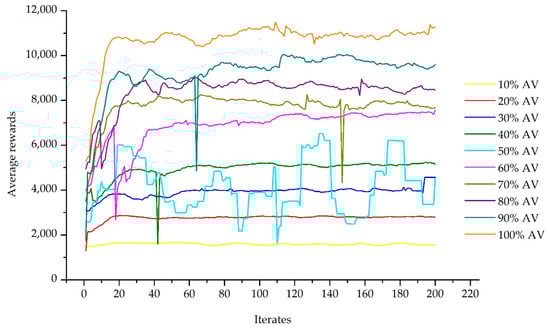 The average reward curve over the 200 iterations based on the AV penetration rate.