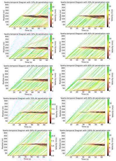 We considered the effect of the leading automated vehicle on the smoothing velocity. Figure 8 shows the spatio-temporal dynamics through the AV penetration rate at the non-signalized intersection. The points are color-coded based on the velocity. The points closer to the top denote smooth traffic. In contrast, the points closer to the bottom denote congested traffic. For the lower AV penetration rates, perturbations occurred due to stop-and-go waves of human-driven vehicle behavior, reducing the velocity in the non-signalized intersection area (ranging from 200 m to 220 m). As can be seen in Figure 8, almost all of the points are close to the bottom in the non-signalized intersection area with the lower AV penetration rates. This is because human-driven vehicles simultaneously approach the non-signalized intersection area and slow down according to the right-of-way rule. At the higher AV penetration rates, the points are close to the top, with the AVs slowing down in a shorter time, thereby producing fewer and shorter stop-and-go waves in the non-signalized intersection area. Full-autonomy traffic achieved the highest smoothing velocity of all AV penetration rates. Thus, the traffic congestion was partially cleared, and traffic flow became smoother as the AV penetration rate increased.