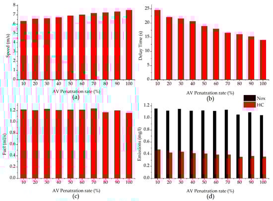 The results of the measures of effectiveness (MOE) evaluation based on the AV penetration rate: (a) average speed vs. AV penetration rate; (b) delay time vs. AV penetration rate; (c) fuel consumption vs. AV penetration rate; and (d) emissions vs. AV penetration rate.
