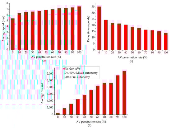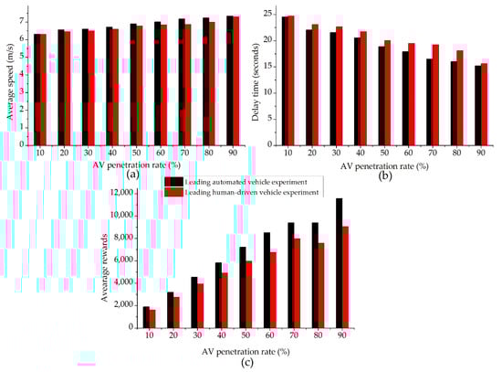 To verify the superiority of the leading autonomous vehicle experiment (the proposed experiment), we compared it with other experiments, including an all human-driven vehicle experiment and a leading human-driven vehicle experiment. The comparison between the proposed experiment and the all human-driven vehicle experiment is shown in Figure 10. Regarding mobility, the proposed experiment achieved a higher average speed and a lower delay time compared with the all human-driven vehicle experiment. As seen in Figure 10a,b, the 10% AV penetration rate achieved an improvement in average speed of 1.16 times and an improvement in delay time of 1.44 times compared with all human-driven vehicle experiment. Furthermore, full-autonomy traffic achieved an improvement in average speed of 1.38 times and an improvement in delay time of 2.55 times compared with the all human-driven vehicle experiment. In terms of energy efficiency, the proposed experiment achieved lower fuel consumption and emissions compared with the all human-driven vehicle experiment. As shown in Figure 10c, the 10% AV penetration rate achieved an improvement in average reward of 3.63 times compared with the all human-driven vehicle experiment. In addition, full-autonomy traffic achieved an improvement in average reward of 24.77 times compared with the all human-driven vehicle experiment. Hence, the proposed experiment outperformed the all human-driven vehicle experiment in terms of both mobility and energy efficiency.