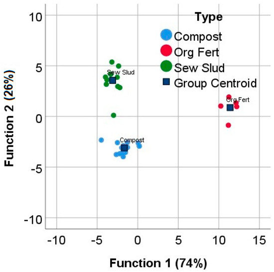 Canonical discriminant functions for the three types of organic amendments using pXRF readings as input variables (missing values corresponding to readings below LOD are replaced with a 0).