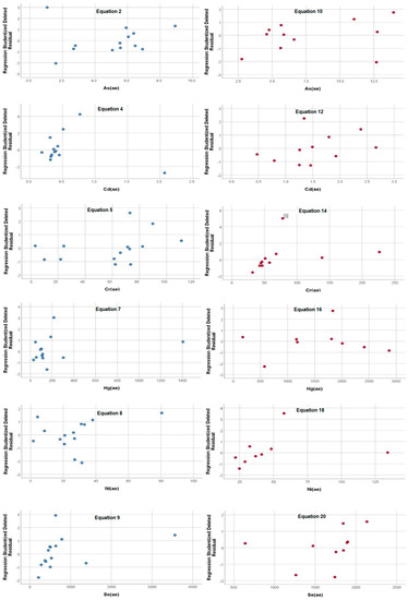 Their statistics are shown in Table 4. The correlation coefficients of the aqua-regia-soluble elemental concentrations, X(ae), and the pXRF readings are shown as supplementary material (Table S2). The Pb(s) readings showed a high correlation with As(ae) and Hg(ae), and thus it was used as the first factor for the calculation of the linear equations of these elements (Equation (10), for As and Equations (15) and (16) for Hg). Successive improvements in the Hg equations were obtained when including the K(s) and Al(m) readings. Zn(s) showed the highest correlation coefficient with Cd(ae) and it was used for modeling Cd (Equation (12)). An additional Pb(s) term was also used in the Equation (12). The readings Cl(m) correlated with Cr(ae) in all 11 sewage sludge samples (Table S2) and was used in Equation (14) with a second significant Ti(s) coefficient. Ti(s) was also correlated with Ni(ae) (Equation (17)) but the Al(m) coefficient was better in nine sewage sludge samples and Equation (18) was also obtained for Ni. The Fe(m) readings further improved Equation (17). The P(m) readings showed a correlation with Se(ae) and Equations (19) and (20) used P(m). The second coefficients in these equations were Fe(m) and Ba(s). In a certain number of samples, significant and high correlations were observed for the As(s) and Cr(s) readings with the corresponding values of As(ae) and Cr(ae) such that direct relationships were fitted between these parameters (Equations (11) and (13)) when the corresponding pXRF readings were above the LOD. All the element coefficients included in the fitting equations were statistically significant (p-values < 0.05). In general, the equations for sludge cannot be considered quantitatively acceptable for calibration (r < 0.98) [28]. The studentized deleted residuals for several sewage sludge equations are shown in Figure 2. No outliers were observed in these plots except one Cr (no. 15) and one Ni data. Furthermore, the absence of a pattern in the distribution of residuals in the corresponding plots in Figure 2 indicates that there was likely no significant bias affecting the equations.