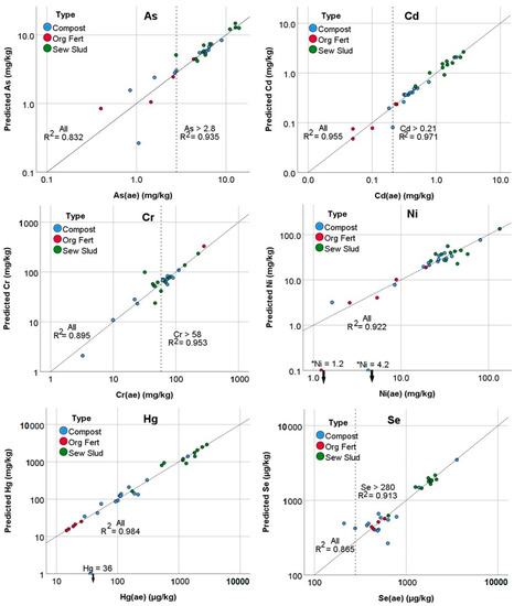 The predicted values for each element, X(pred), obtained for the three amendment types with the equations in Table 3, Table 4 and Table 5 are plotted in Figure 3 (in log scale) against each corresponding “true” aqua regia concentration, X(ae). The R2 coefficients are shown on each plot. The linear equations (data not shown) presented a very small value for the 0 intersections and the slopes were very close to 1. This can be seen by the proximity of points to the 1:1 line that is represented in the plots. When all the data were considered, the values of R2 ranged between 0.83 in the case of As to 0.98 in the case of Hg.
