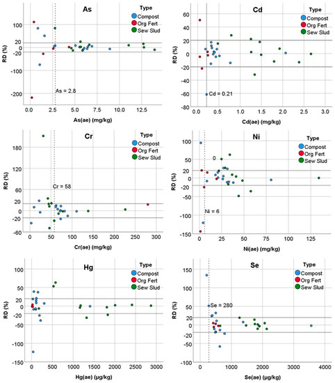The limits established by European legislation [35] for these contaminants in a growing medium are 1.5 mg Cd kg−1, 1000 µg Hg kg−1, 50 mg Ni kg−1, and 40 mg inorganic As kg−1. As can be seen in Figure 2, these limits are included (for Cd, Hg, Ni) or are higher (for As) than the ranges in which these elements have been determined. Furthermore, the precision of the predictions (Figure 4) above the indicated values was, in general, satisfactory. Only a few samples of sewage sludge, a type for which much higher statutory limits apply [36], exceeded the RD limit of 20%. This means that the pXRF technique with the indicated proxies could be valid to test the compliance of these types of products, at least for quality control purposes in the field or the factory applications. Even an analyte with more than 20% RD may be used, as long as its linearity is satisfactory, as it could allow for properly ranking samples and detecting outliers [37].