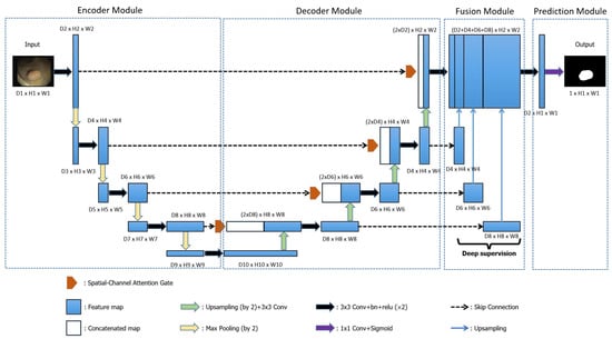 Figure 1 describes how to integrate our proposed scAG to the baseline U-Net. Similar to the works in [,], we utilize deep supervision [] that allows for more direct back propagation to the hidden layers for faster convergence and better accuracy. Using deep supervision forces the attention map at the intermediate features to be eagerly discriminative at each specific level, thus improving the performance of the model.