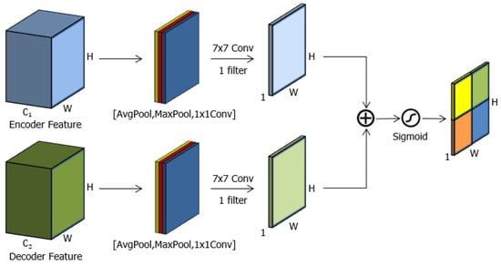 As illustrated in Figure 2, the spatial attention map is a combination of spatial information from both encoder and decoder features. To compute the spatial attention map in each encoder and decoder feature, we first apply average pooling, max pooling, and convolution through the channel dimension and then concatenate them to construct a capable feature representation. Applying the average pooling and max pooling through the channel dimension, inspired by [], and applying a convolution, inspired by [,], are effective to represent the important information. We then apply a convolution layer on the concatenated features to produce a spatial attention map that highlights the salient region. The above process is applied for each encoder and decoder feature separately. Finally, we summarize the spatial attention map from the encoder feature and decoder feature to compute the final spatial attention map. The detailed operations are shown below.