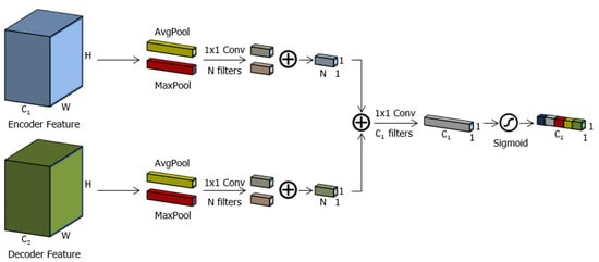 We aggregate information along spatial dimension of each encoder and decoder feature map by using the pooling operation. and denote the map generated from average pooling and max pooling, respectively. Those generated maps are then forwarded to the shared N 1 × 1 convolutions to produce a squeeze channel attention map. After the shared N convolution operation, we combine the output attention by applying element-wise summation. and denote the generated squeeze channel attention map of the encoder and decoder features, respectively. The summation of and was forwarded to convolutions, and then a sigmoid function is applied in order to obtain the final channel attention map . In short, the channel attention map is computed as: