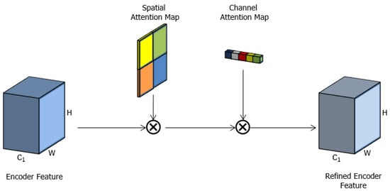 where ⊗ denotes element-wise multiplication, and the spatial attention map , and channel attention map are copied along the channel dimension and spatial dimension, respectively, resulting in the same sizes as the input feature map. The details of the channel and spatial attention gate are as follows.