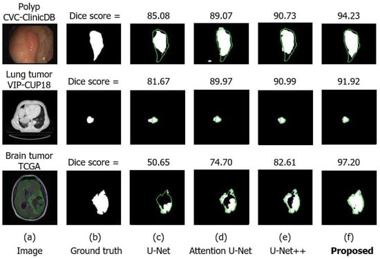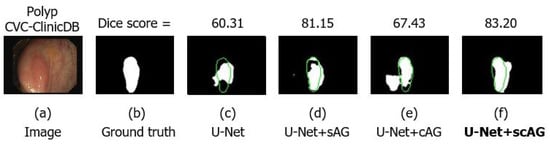 We evaluate our proposed method with state-of-the-art U-Net architectures in semantic segmentation tasks, such as Attention U-Net [,] and U-Net++ [,]. For experiments on the CVC-ClinicDB dataset, the baseline U-Net yields a dice coefficient of 65.93%. In Table 4, Attention U-Net and U-Net++ achieve accuracy of 67.57% and 68.89%, respectively. Our proposed scAG boosts performance to 73.31%, which increases an approximately seven-point gap when compared to the standard U-Net model though adding small parameters, as shown in Table 4. Besides, for the lung tumor dataset provided by VIP-CUP, our proposed scAG shows a dice coefficient of 56.26% and also outperforms the Attention U-Net and U-Net++ with a performance of 53.15% and 54.66%, respectively. For the brain dataset from TCGA, our proposed scAG still surpasses Attention U-Net and U-Net++ with a dice score of 85.83%. Attention U-Net was designed using the attention gate model, which is beneficial for locating the target object, but lacks focus on different semantic information between the encoder and decoder features. U-Net++ was proposed by redesigning the dense skip connection to alleviate the gap semantic between the encoder and decoder features, and it thus offers better segmentation results. By capturing useful information from both spatial and channel information using scAG, our proposed U-Net outperforms other state-of-the-art U-Net architectures.