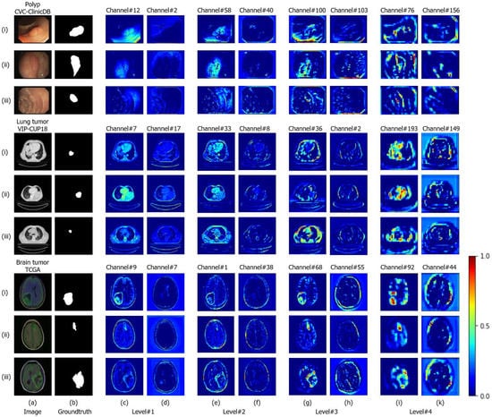 For the sAG, we focus on the spatial attention map at all four levels. Figure 9 shows the spatial attention map from level #1 to level #4, which is multiplied with the corresponding encoder feature maps for further calculation. As we can see for the spatial attention map at level #4, where the spatial attention map depicts the general, coarse-grained details of the salient region to have a low resolution. As we gradually go to a higher resolution, the spatial attention map becomes more specific and fine-grained to emphasize the salient region of the target object. For example, look at row (i) of the polyp image of the CVC-ClinicDB dataset, we draw the spatial attention map created by sAG at all four levels. At level #4, where the feature maps have the coarse spatial information, sAG can only focus on the general, coarse-grained salient region of polyp in the features. However, when going up on a level where have higher resolution feature maps, the spatial attention map becomes more clear. At level #1, sAG can now concentrate on specific, fined-grained polyp regions. By focusing on the most salient region of interest on the encoder features, where each has rich spatial information, the network can predict the details of the segmentation results.