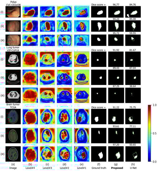 In order to have the best view of the spatial attention map as well as the segmentation results of our scAG, we provide an illustration in Figure 9. For example on CVC-ClinicDB, standard U-Net seems to over-segment the polyps (row (i), column (g)). Our proposed method segments the polyps much better, close to the ground truth (row (i), column (h)). On row (ii) of the VIP-CUP18 dataset, although the Dice score for both standard U-Net and our proposed method are quite similar (87.04% versus 89.43%), the predicted tumor masks are very different (columns (g,h)). The predicted masks from our method are similar in shape with the ground truth while U-Net tends to produce irregularities along the boundaries. For the TCGA dataset, at a small tumor figure on row (ii), our proposed method can produce a sharp tumor mask as compared to U-Net, which fails to make a sharp prediction (columns (g),(h)). Thanks to the powerful ability of our scAG, the proposed U-Net obtains superior results as compared to the standard U-Net, as shown in Figure 9g,h.
