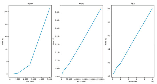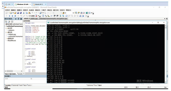 Next, we test the performance of our scheme. The source code of our implementation is given in Appendix A. It includes three files, stdafx.h, stdafx.cpp, and unlimited homomorphic encryption.cpp. "stdafx.h" defines all the data structures. "stdafx.cpp" defines all of the functions. The functions are invoked in "unlimited homomorphic encryption.cpp". Appendix B lists the source code of an implementation based on the Helib library. The implementation uses similar parameters as ours. Figure 2 lists their executing time. Our test machine is a ThinkPad X1 laptop with Intel(R) Core(TM)i7-8750H CPU @2.2GHz 8 cores Visual Studio 2005, Microsoft, Redmond, WS, USA).