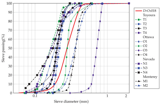 Sieve analysis of DrOS018 sand compared to the similar sand types in literature: Toyoura sand: T1—[14], T2—[13], T3—[18], T4—[12]; Ottawa sand: O1—[12], O2—[22], O3—[23], O4—[7]; Nevada sand: N1—[20], N2—[19], N3—[7]; Monterey sand: M1—[22], M2—[25].