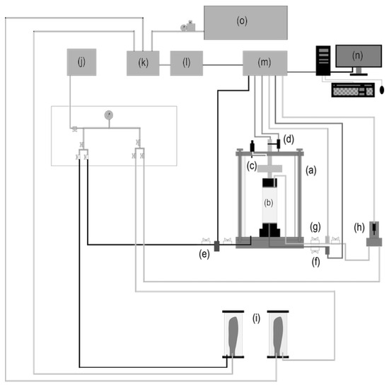 Scheme of static triaxial system: (a) triaxial cell, (b) sample, (c) load cell, (d) Linear Variable Differential Transformer, (e) cell pressure transducer, (f) pore water pressure transducer, (g) back pressure transducer, (h) volume controller, (i) pneumatic pressure system, (j) deaired water tank, (k) servo-flow, (l) RTC module, (m) ATD data logger, (n) personal computer, (o) compressed air distributor.