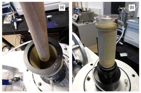 As it is specified in Table 2, specimens at three different densities were tested in this research. To achieve comparable results, the undercompaction method in specimen’s preparation was employed. The method was developed by Ladd [49] and provides continuous density throughout the sample height and it was used in laboratory tests very often. The method ensures repeatable test results, minimizes particle segregation and offers a preparation of reconstituted sand specimen, [49]. Figure 4 presents the specimen preparation using undercompaction method (Figure 4a) and prepared specimen for drained compression test (Figure 4b). The diameter of a compaction rod was 1 cm and was made of a hard wood. This ensured the best control of energy used for compaction and reduced the possibility of grain crushing during compaction process.