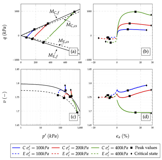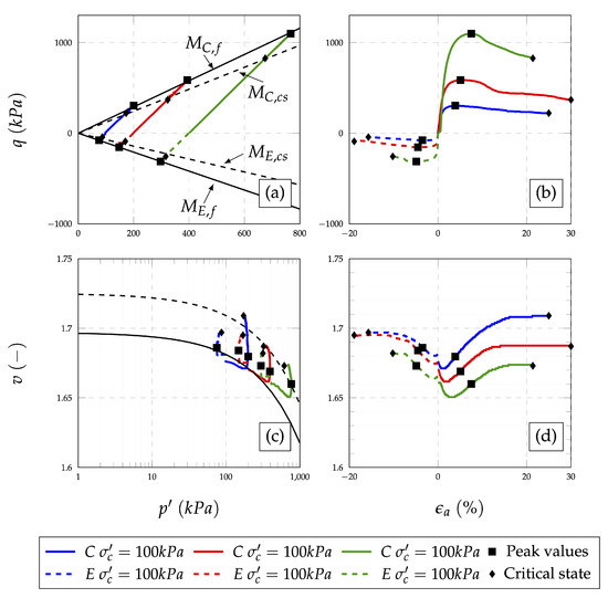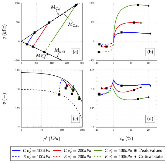 Fit parameters were determined as nonlinear fit model parameters based on the nonlinear regression algorithm [54,55,56] with the assumed shape of the fit function that corresponds to the Equation (5).The thick line presents the isotropic consolidation curve, while the dashed line presents the critical state curve. Values of the fit parameters from Equation (5) are presented in Table 4 and can be used as an input parameter for simple numerical analysis. The change in specific volume (v) related to relative axial deformation () are plotted on Figure 5d, Figure 6d and Figure 7d. Stress-strain behaviour for both compression and extension types of tests are presented in Figure 5b, Figure 6b and Figure 7b. Deviator stress q is plotted against relative axial strain . The variation of specific volume with mean effective stress is plotted in Figure 5c, Figure 6c and Figure 7c. Values of specific volume after consolidation stage and after shearing stage are approximated with the curve rather than a line, as suggested by Been et al. [9] using the Equation (5). The thick line presents the isotropic consolidation curve, while the dashed line presents the critical state curve. Values of the fit parameters from Equation (5) are presented in Table 4 and can be used as an input parameter for simple numerical analysis. The changes in specific volume related to relative axial deformation are plotted on Figure 5d, Figure 6d and Figure 7d.
