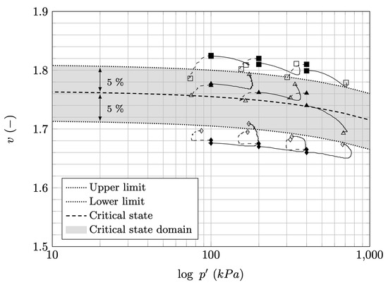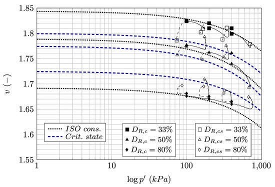 The data from Figure 5c, Figure 6c and Figure 7c are plotted in Figure 8 where filled square marks present the values of specific volume after isotropic consolidation stage while the empty square marks present the specific volume at the assumed critical state. Densely dotted curves are presenting the isotropic consolidation curves, while the dashed curve present the critical state.