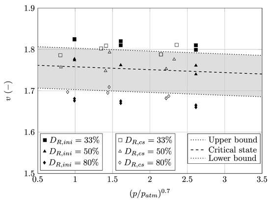 Values of specific volume after consolidation stage and after shearing stage are approximated with the curve rather than a line, as suggested by Been et al. [9] using the Equation (5).