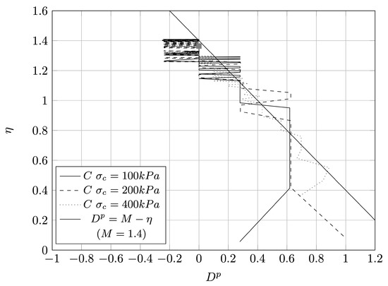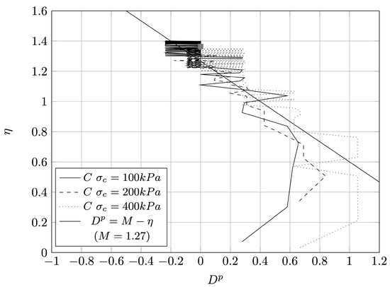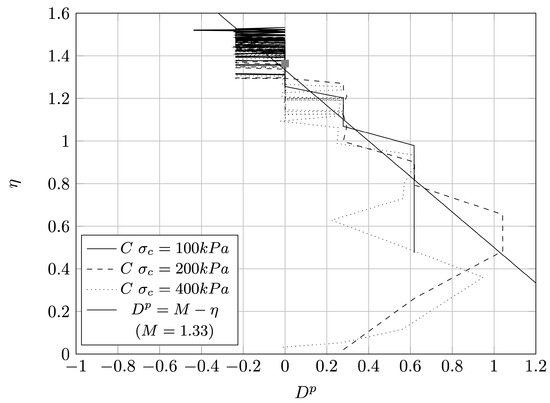 It can be identified a small negative plastic dilatancy for loose sample, indicating that the sample could exhibit small dilatative behaviour. Critical state stress can be found if the maximum stress ratio is plotted against the minimum plastic dilatancy , as proposed by Vaid and Sasitharan [60] and Been and Jefferies [28]. Scatter plot in Figure 14 presents the relationship between the two mentioned parameters. According to Nova and Wood [61] and Jefferies and Shuttle [62], the data can be approximated with the Equation (11) and which leads to the critical stress ratio M of 1.364 and equivalent effective angle of friction :