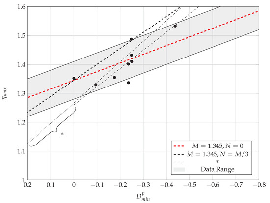 The data in Figure 8 present a tendency toward a critical state. The data from Figure 9 is plotted using the power low given with Equation (5), [57]. The exponent is used as a best fit parameter, which is determined based on the data in Table 4. The data are presented in Figure 9. The upper and lower bound of critical state can easily be defined as well as the best approximation of critical state line (approximated dashed line).
