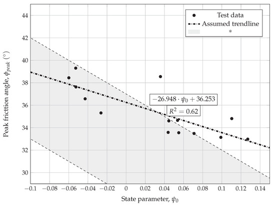 In Figure 14 the values of minimum plastic dilatancy and maximum stress ratio are plotted and compared with the data obtained from literature. Approximation lines for the volumetric coupling parameter equal to and [63] are compared as well.