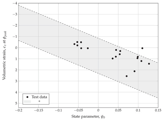 Values of state parameter are plotted related to the peak friction angle (Figure 15) and against the volumetric strain at the peak friction angle (Figure 16). The shaded part of the figures present the range of data from various tests [60,62,65].