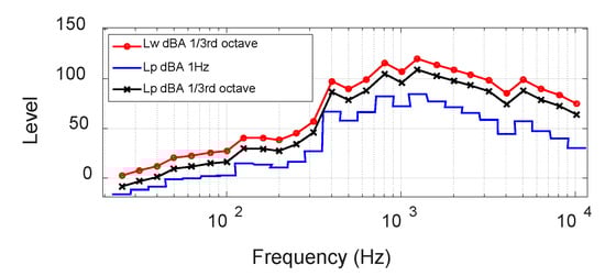 The distance r to the sound source for which the sound pressure levels were calculated was 1 m for both types of sources (‘car’ and ‘ambulance’). Spherical propagation (isotropic propagation) was also considered, for which Q must be equal to 1. Under these two assumptions, the sound pressure level (Lp) of a point source was 11 dB less than its sound power level (Lw) at any frequency.