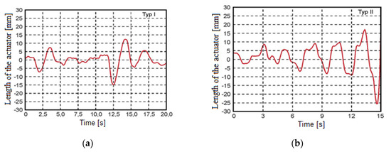 When riding, the length of the hydraulic actuators continuously changed (Figure 3) due to the driver constantly acting on the steering wheel. The steering wheel’s rotation as the driver reacted to the on-vehicle’s location, strongly depended on speed, driver experience, and type of hydraulic steering system, but typically during stable movements, steering wheel rotation did not exceed 20°, with an average frequency of 0.4 Hz [23]. According to Chaczaturow et al. [24], driver action caused driver lateral displacement or driver angular deviation from the strip axle. During straight-line car driving, angular deviation did not exceed 0.5° and the reason for driver action was mainly lateral driver displacement. Previous research [2] confirmed this and showed that driver perception and sensing were limited. During driving on a straight strip, humans do not sense a lateral displacement error of up to 0.1 m and a yaw deviation of up to 0.5°.