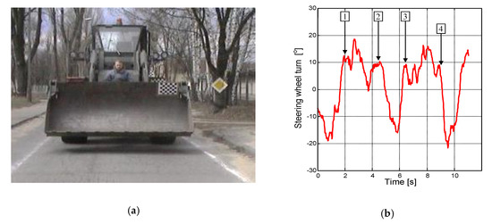 View of the modified loader with driver before front axle and direct hydraulic steering system during straight-line test (a), and driver reactions during modified loader straight-line test at a speed 28 km/h (b).