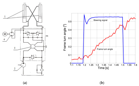 Driver aid system—(a) diagram of hydraulic steering system with additional driver-aid system: 1—steering hydraulic actuator, 2—main pump, 3—hydraulic steering unit, and 4—additional pump with electric drive; and (b) frame turns as results of additional gear pump operation.