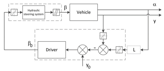 During straight-line driving and vehicle stability investigation [24,31], the main signals for driver behaviors were lateral displacement and yaw angle (Figure 8)—and models with these inputs were sufficient. Considering the results from investigating the nonlinearity, reflecting time lag and limited driver sensing were introduced (Figure 9). The assumption for the model was that the driver always observed a point on the road. The observable point lay on the required vehicle trajectory at a distance of L from the driver. Distance L depends on vehicle velocity and curvature of trajectory. Any lateral or angular driver inclinations might cause the driver’s reaction.