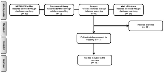 The initial search resulted in 42 titles on MEDLINE/PubMed, 42 titles on Scopus, 21 on Web of Science, and none on Cochrane Library. After critical reading, 13 studies [1,2,9,14,15,16,17,18,19,20,24,25,26] published between 2011 and 2018 were included in the current overview. All full-text articles assessed for eligibility were included in this overview (n = 13). A search of grey literature did not result in any additional studies. The process of searching for and selecting articles can be followed in Figure 1.