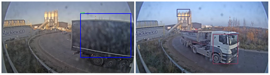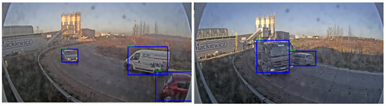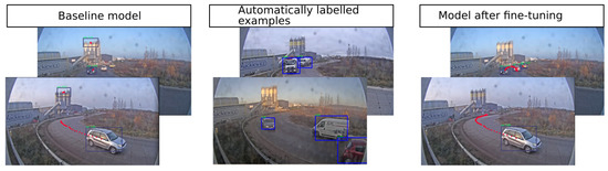 Qualitative results of the improvement are presented in Figure 9—vehicles were tracked for a longer number of steps because they were much better detected at the the far-end. Such an improvement could be beneficial for increasing the accuracy of speed measurement. Additionally, many of the false-positive detections were removed. It should be noted that trucks are still poorly detected by the fine-tuned detector. That is because the initial detector did not detect trucks well in that environment, which means that automatically discovered examples of trucks were rare, and their labels have been noisy (Figure 10). As a result, when fine-tuning the model, there was an insufficient amount of labels for trucks to help significantly improve their detection.