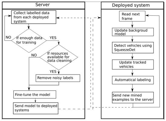 In this section, our method for automatic adaptation of the deployed detector is presented (Figure 2). The deployed system consists of a camera and an embedded platform that is responsible for real-time traffic analysis, and for sending all relevant information to the main server. The core server collects the data from all endpoints, and fine-tunes the models, which are sent back to the deployed systems, meaning that all of the systems share the same detection model. Finally, if possible, a human might filter the automatically obtained samples by simply removing samples with wrong annotations. That allows us to further improve the efficiency of the model with minimal human effort required. The SqueezeDet architecture that was used for detection is described in Section 3.1, the SORT tracking method in Section 3.2, and the introduced labelling module with fine-tuning details in Section 3.3.
