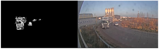 Because the traffic monitoring system works with a static camera, a reliable model of the background can be created to improve the detector accuracy. For this purpose, a popular background subtraction method created by Bowden et al. [42] is used. It is a Gaussian Mixture-based method, where each pixel is modelled by a mixture of K Gaussian distributions (K = 5 is used in our experiments). Figure 4 shows an example of the foreground/background separation.