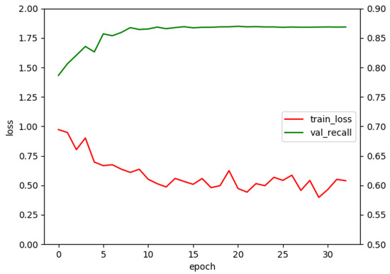 The final model for testing was chosen based on the best recall value in the validation set. The model prediction was counted as accurate when an IOU with the ground-truth box was greater than 0.5 as in the PASCAL VOC challenge [43]. For the input size, experiments with the image size set to 480 × 270 pixels, and 360 × 203 pixels were conducted. The first resolution achieved a higher recall (86.9% vs. 81.7%). A further increase of accuracy would not allow for real-time processing; which is why the 480 × 270 resolution was used for further experimentation. When the detection module was deployed to a Jetson Tx2, it worked at a speed of 13.7 frames per second (fps). When the SORT tracker, and background subtraction method were added to allow automatic labelling, the whole system worked at a speed of 9.1 fps, which allowed for system deployment. Such a speed allows for the model working in real-time during the automatic labeling stage by processing approximately every third frame. Consequently, for our experiments, every third frame is used only when collecting new samples for the model’s fine-tuning. Figure 5 shows the training history for the selected model.
