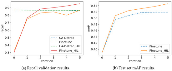 After the labels were collected, they were split into training and validation parts at a ratio of 4:1. During the fine-tuning stage in each epoch, the model was trained on automatically labelled data as well as the same number of randomly selected examples from the UA-Detrac dataset while using the rehearsal technique. The model was validated on the UA-Detrac validation set, and on newly mined data. The model for further testing was chosen by computing a weighted average of the recall on both datasets. In our case, a 9:1 weight ratio was used, because the UA-Detrac dataset is much bigger and those labels contain less noise. One crucial aspect that helped the model to actually work was removing cross-entropy classification from the loss function (Equation (2)). This was done because the trained model was a relatively poor classifier of the detected vehicles in the deployment environment. Figure 8a presents validation results after each day.