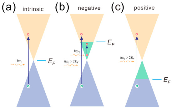 (a) Schematic illustration of interband transitions in intrinsic graphene. (b,c) Intraband and interband transitions with a negative bias voltage and a positive bias voltage, respectively.