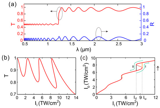 As the intensity of incident light is strong enough, so that the third-order nonlinear modification to the surface conductivity of graphene reaches the order of linear counterpart, the influence of light intensity on the transmittance and output intensity of light should be considered. For a fixed incident wavelength, Figure 3b provides the relationship between transmittance and the intensity of incident light. It can be seen that the transmittance oscillates as the input light intensity increases. In addition, the amplitude of oscillation enlarges gradually. Furthermore, with the increase in intensity of incident light, the negative slope of transmittance curve appears, indicating that optical bistability may be achieved.