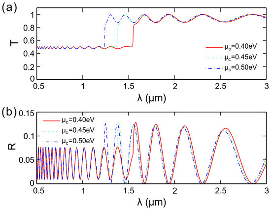 For different chemical potentials, Figure 4b displays their corresponding reflection spectra. One can see that the peaks in reflection spectra are just at the valleys in transmission spectra for a given chemical potential, that is, the maximum transmittance is the conjugate of the minimum reflectivity. For a shorter incident wavelength, interband transitions of electrons in graphene are dominant and graphene can be viewed as metals, so the loss of graphene is greater, and the transmittance is lower. As the incident wavelength increases, intraband transition dominates and the loss of light in graphene decreases. Meanwhile, most of the light has been transmitted. Interband transition only occurs as the incident photon satisfies the condition ħω1 > 2|EF|. The electrons emitted by interband transition lead to considerable loss of light. Therefore, with the increasing of the chemical potential, the lower limit of frequency of photons required for interband transition increases, which results in a shift in the R and T curves towards lower wavelengths, which could be utilized to modulate the reflectivity and transmittivity of light.