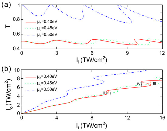 The negative value in the curve slope of the nonlinear transmittance indicates that optical bistability may be realized if given an appropriate incident intensity. Figure 5b provides the input–output relationship for different chemical potentials. It can be seen that, for μc = 0.40 eV, two bistablities appear in the curve within a given input intensity interval. As the intensity of incident light increases, there are two upward jumps, namely I and III, while the incident light intensity decreases, there are two downward jumps, namely II and IV. This specialty can be applied to polymorphic switches. The upper and lower thresholds of bistability can be tuned by an external voltage on graphene.