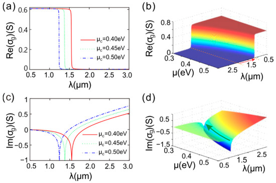 The imaginary part Im(σg) of the surface conductivity represents the real part of the refraction index of graphene. For three given different values of chemical potential, Figure 6c demonstrates Im(σg) varying with the incident wavelength. There is a sink in each curve and the sink has a blue shift as μc increases. However, this obvious feature has a very limited effect on the transmittance due to graphene being ultrathin. It may significantly disturb the complex phase of reflection coefficient.