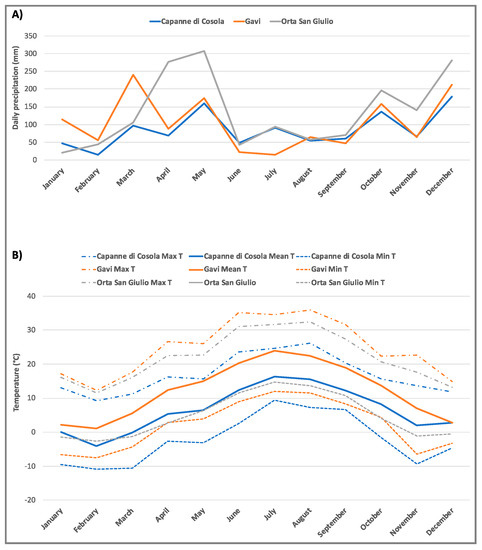 Climatic data for the three sampling sites (Capanne di Cosola, Gavi, Orta San Giulio). (A) Daily mean precipitation (mm); (B) temperature (T) (mean temperature, minimum temperature and maximum temperature) (°C).