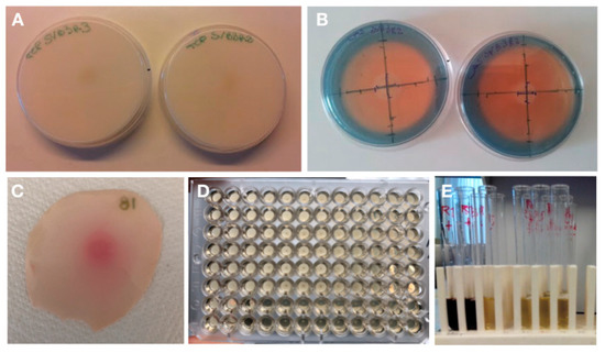 Screening of the physiological traits involved in plant growth promotion. (A) Phosphate solubilization on tricalcium phosphate (TCP) medium (bacterial growth indicates phosphate solubilizing activity); (B) siderophore synthesis on Chrome Azurol S (CAS) agar (orange halo); (C) IAA production (pink halo); (D) tolerance to salt stress evaluated as minimal inhibitory concentration (MIC) showing the tolerance of bacterial strains to specific molecules. The well was considered positive when the presence of a bacterial cell pellet was observed; (E) 1-aminocyclopropane-1-carboxylate (ACC) deaminase synthesis (brown/black color development).