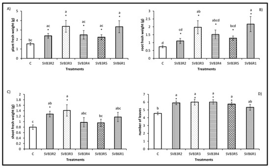 Effects of the selected bacterial strains on sorghum growth parameters (plant fresh weight, (A); root fresh weight, (B); shoot fresh weight, (C); and leaf number, (D)). The values presented in the figures are means ± standard errors (n = 10). Bars topped by the same letter do not differ significantly at p < 0.05 by one-way ANOVA followed by Fisher’s post hoc test. Bars topped by * are significant at p < 0.05 by one-way ANOVA followed by Fisher’s post hoc test compared to uninoculated control plants. Plant treatments: uninoculated plants (C), Plants inoculated by P. migulae SVB3R2 (SVB3R2), P. migulae SVB3R3 (SVB3R3), P. migulae SVB3R4 (SVB3R4), Pseudomonas sp. SVB3R5 (SVB3R5) and P. brassicacearum SVB6R1 (SVB6R1).