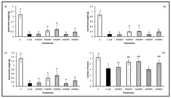Effects of the selected bacterial strains on growth parameters (plant fresh weight, (A); root fresh weight, (B); shoot fresh weight, (C); and leaf number, (D)) of sorghum grown in the presence or in absence of 150 mM NaCl. The values presented in the figures are means ± standard errors (n = 7). Bars topped by the same letter do not differ significantly at p < 0.05 by one-way ANOVA followed by Fisher’s post hoc test. Bars topped by * are significant at p < 0.05 by one-way ANOVA followed by Fisher’s post hoc test compared to uninoculated control plants exposed to salt. Plant treatments: uninoculated plants (C), Plants inoculated by P. migulae SVB3R2 (SVB3R2), P. migulae SVB3R3 (SVB3R3), P. migulae SVB3R4 (SVB3R4), Pseudomonas sp. SVB3R5 (SVB3R5) and P. brassicacearum SVB6R1 (SVB6R1).