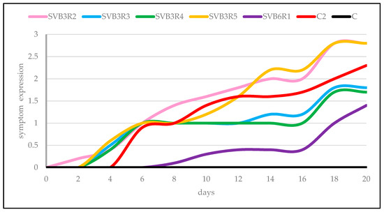 Symptom expression in uninoculated plants started on the fourth day of treatment and 42.9% of the plants died after 20 days of growth. In the same way, all plants inoculated with the bacterial endophytes, except those inoculated with P. brassicacearum SVB6R1, began to show minor symptoms on the sixth day. At the time of harvest, 80% of the plants inoculated with strain SVB3R2 were dead. In contrast, none of the plants inoculated with strains SVB3R3 and SVB3R4 died by the 20th day. However, 83% of the plants inoculated with SVB3R3 and 71.4% of those bacterized with SVB3R4 showed strong symptoms by the end of the experiment. Similarly, only 20% of the plants inoculated with SVB3R5 survived at the end of the experiment besides showing strong symptoms. Only 28.5% of the plants inoculated with P. brassicacearum SVB6R1 died by the last day of the experiment, while 28.5% and 14.3% of the plants showed weak and strong symptoms, respectively, starting from the 18th day. Moreover, 28.5% of the plants remained symptomless. Weak symptoms were observed in 42.8% of the plants inoculated with strain SVB6R1, starting from the 12th day, thus indicating a significant delay in symptom expression compared to the uninoculated control (Figure 6).