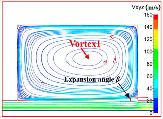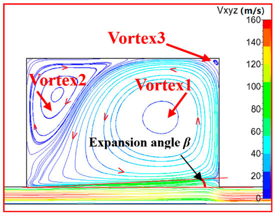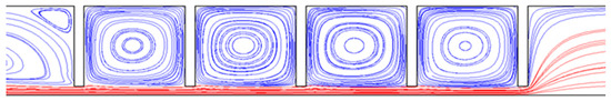 Based on the numerical of the see-through labyrinth seals in Figure 5, the streamline diagrams of the middle sealing chamber using SCO2 and air as working fluids are shown in Figure 9 and Figure 10 respectively. Compared with the air flow, the SCO2 flow has smaller viscosity, higher density, and larger inertia. As a result, the expansion effect of the SCO2 main flow is weak and the vortex flow has a smaller number of vortices. It can be found that the expansion angle of the SCO2 main flow is smaller and the kinetic energy transport effect is more obvious, so the residual kinetic energy coefficient θ of the SCO2 labyrinth seal may be higher than that of the air labyrinth seal.